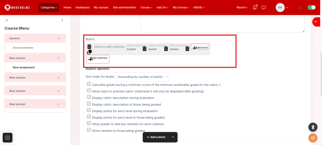 - Click on the rubric box to add the criteria, level and point