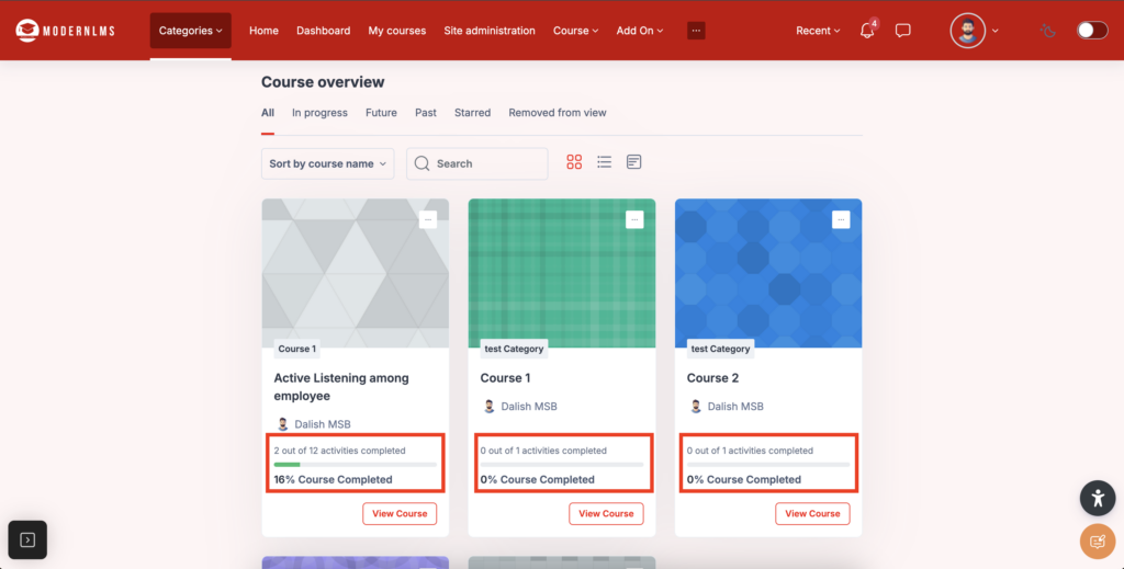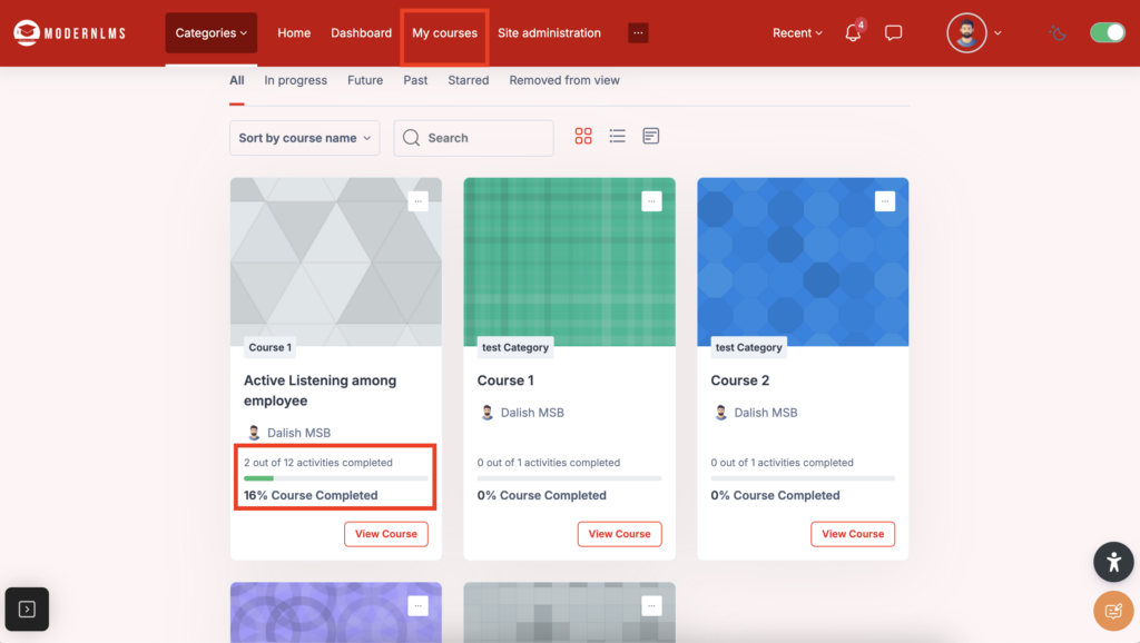 - Monitor the completion progress of students through the My Course section in your LMS. You can track completion data for each activity and student.