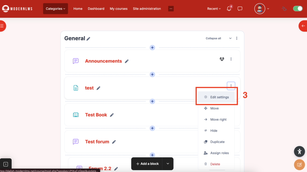 - Click at 3 dot of your activity/resource and select “Edit settings”.