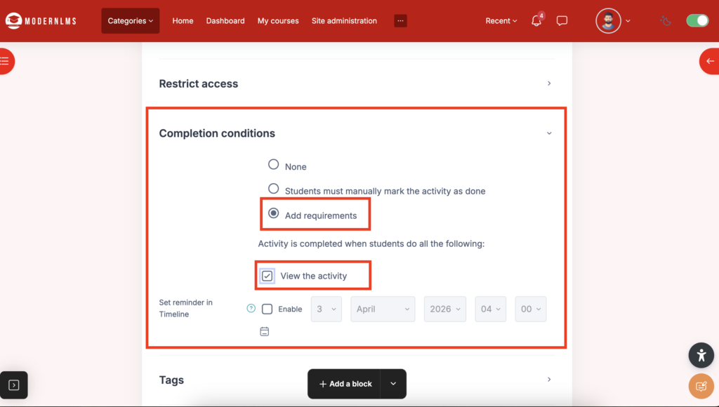 - Add requirements: Allows you to add specific requirements for completion, such as requiring students to view a certain number of pages, complete a quiz, or participate in an activity.