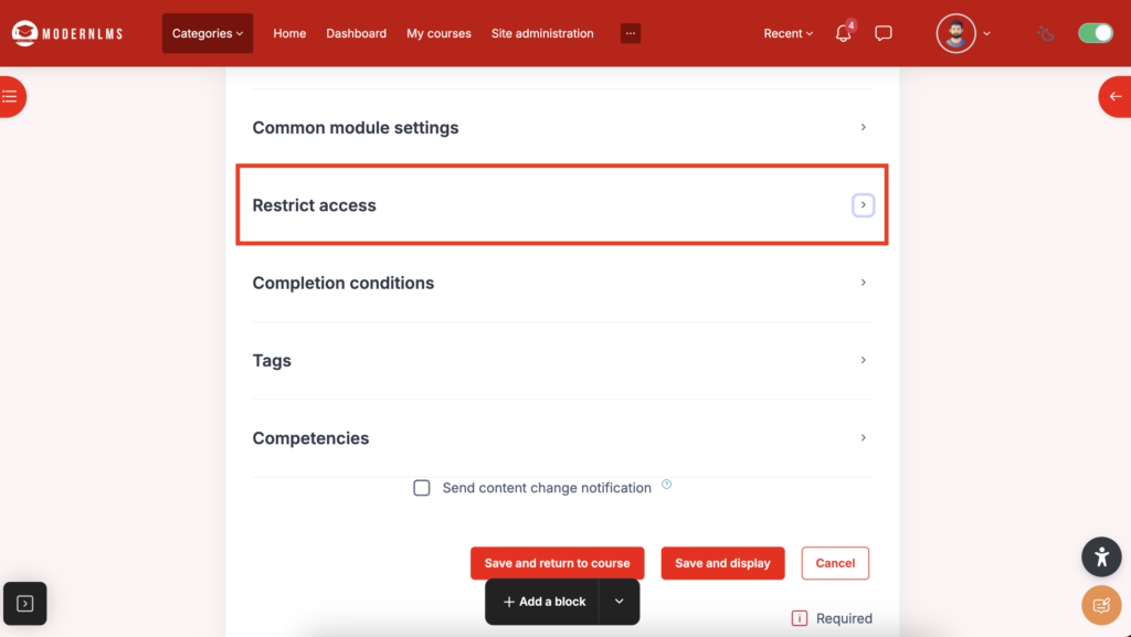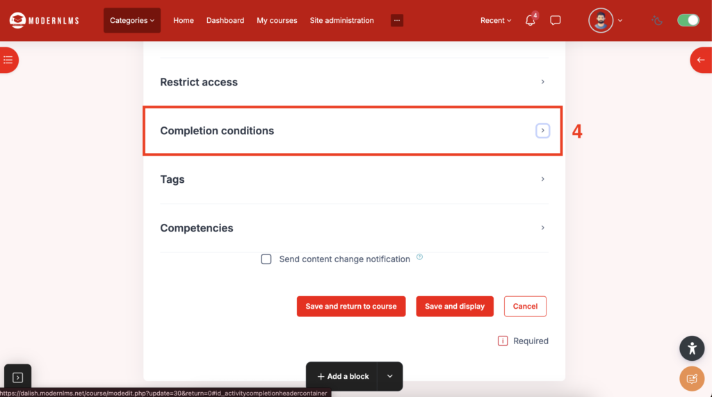 - After configuring the completion conditions, ensure you save the settings to apply the changes “Save and return to course”.