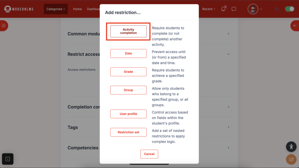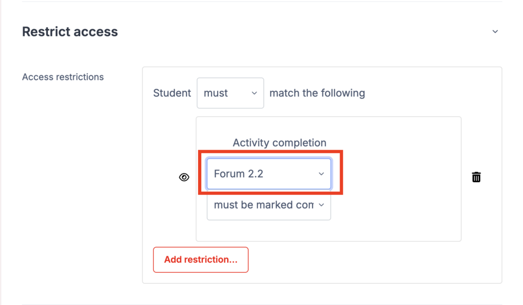 - Activity completion: Restrict access to student completion.